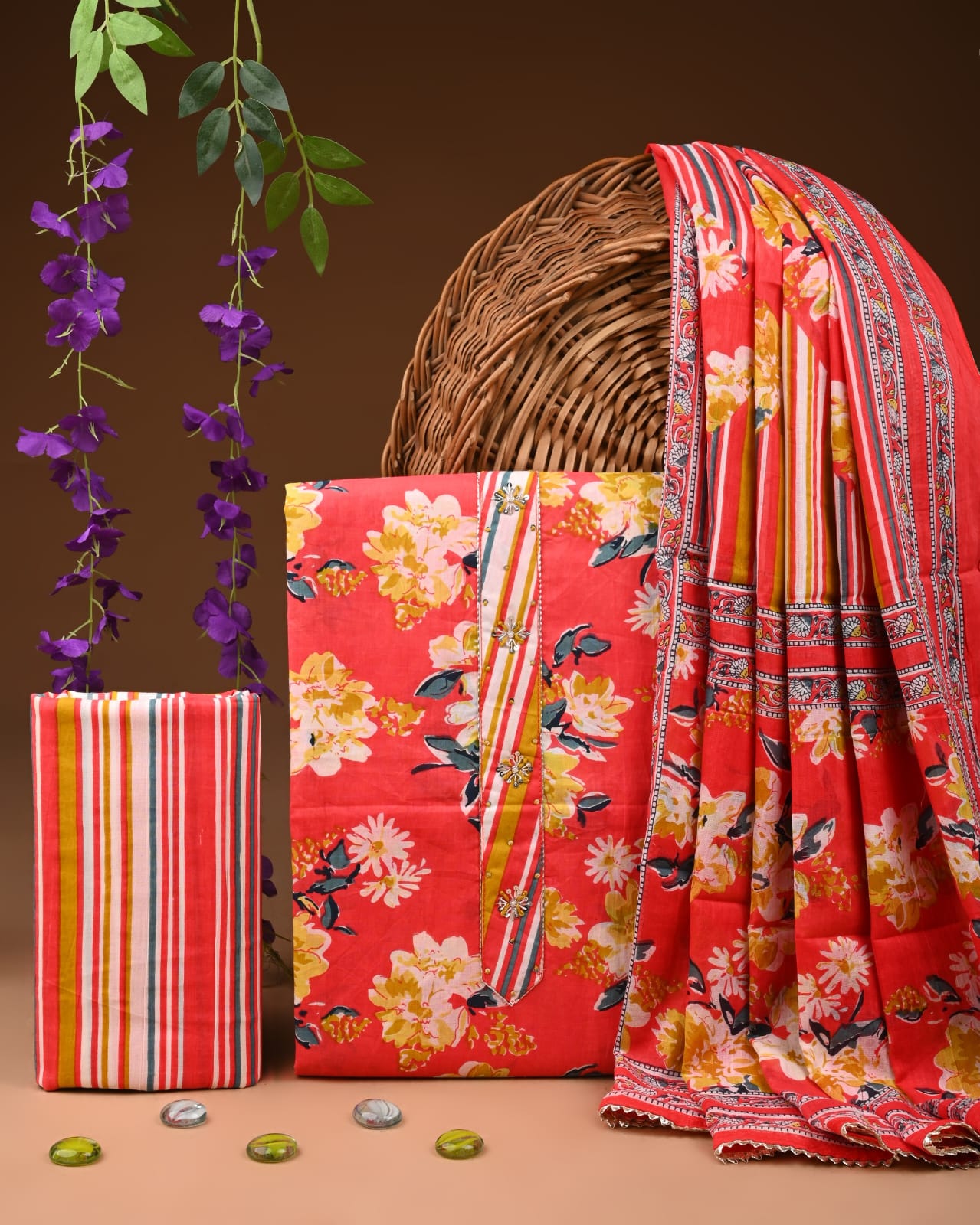 Elegance to your ethnic collection with our exclusive unstitched cotton suit set, designed with intricate Gota Patti craftsmanship and fine detailing. Perfect for festive celebrations, casual outings, or gifting, this 3-piece set blends tradition with comfort.
